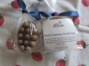 In the Lathers for Life Soap Shop, all the soap is unique and beautiful — not to mention, good-for-your-skin! Spa Mocha Espresso Scrub Soap is about as unique and special as it can be! These coffee-and-chocolate scented soaps are shaped as a handy massage bar, complete with coffee grounds to add the extra scrub. And as I said, they smell really nice — like chewy chocolate candy (but don’t take a bite — that would not be good!)!