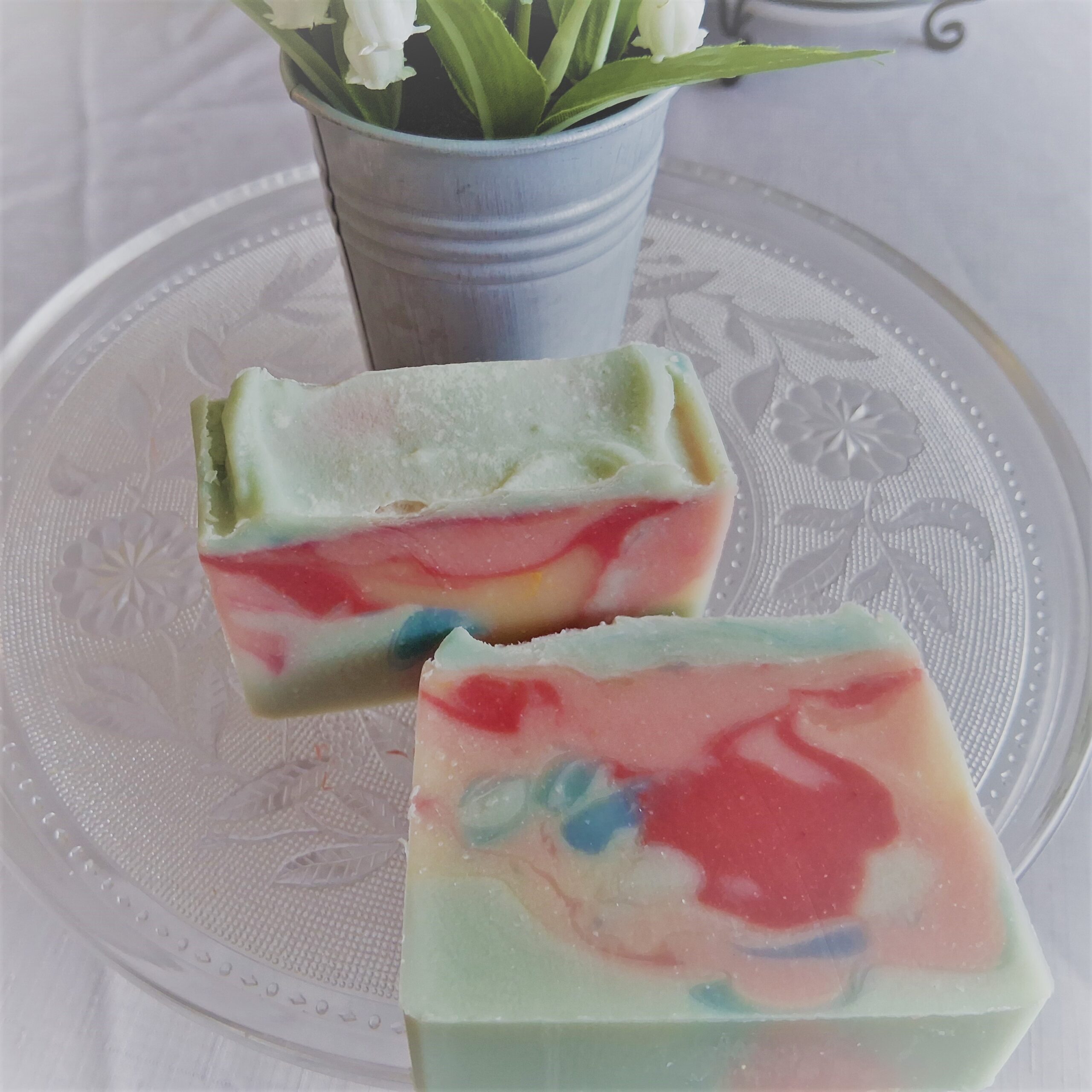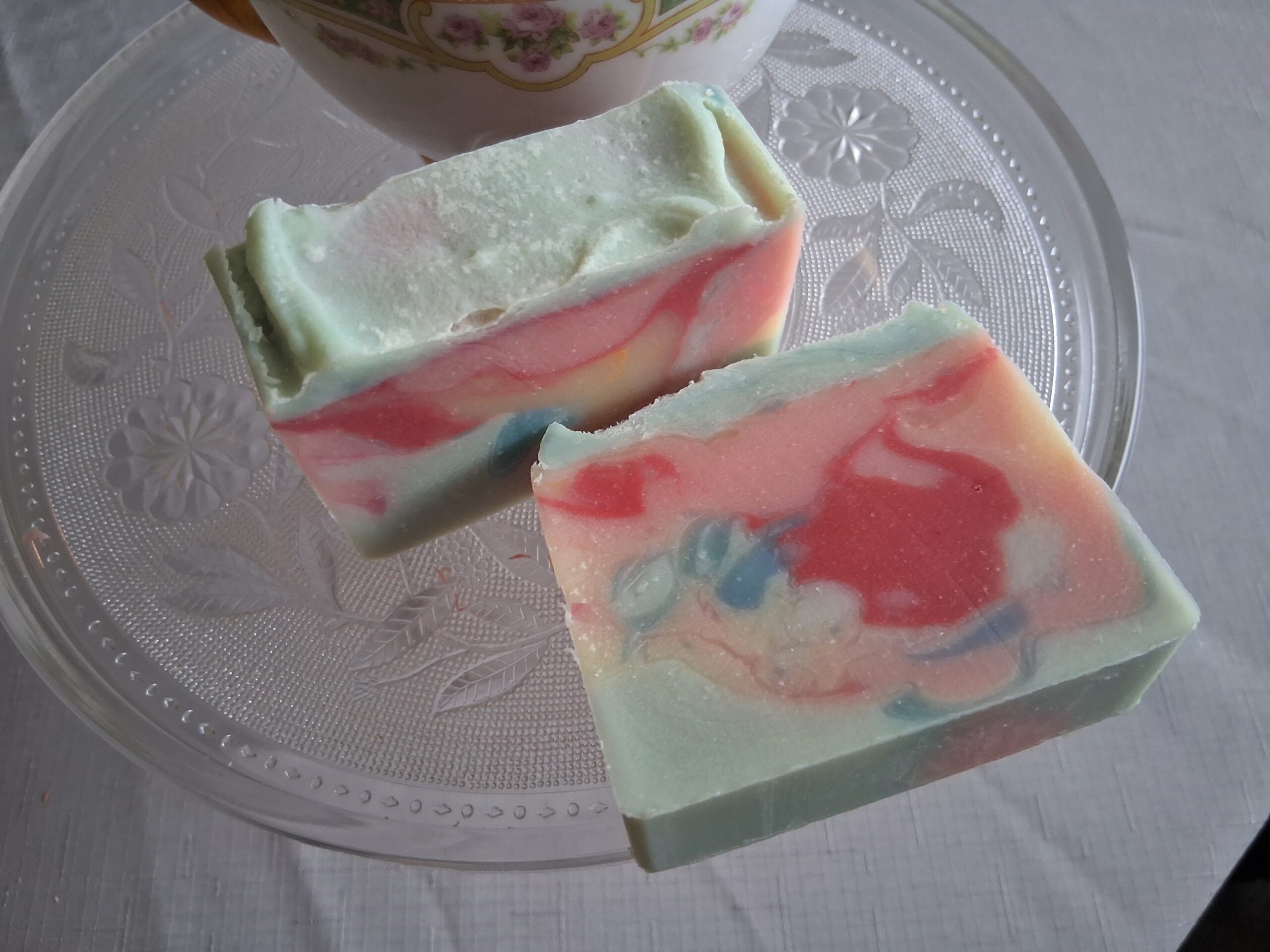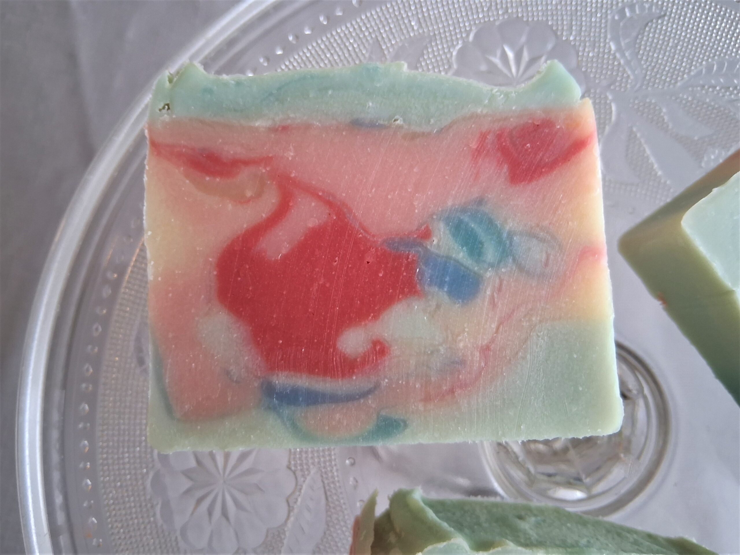 This pale blue soap has lovely swirls of light blue, dark and light pinks, and a touch of pale yellow. It’s very pretty and unique. It will look like useful art in your soap dish!