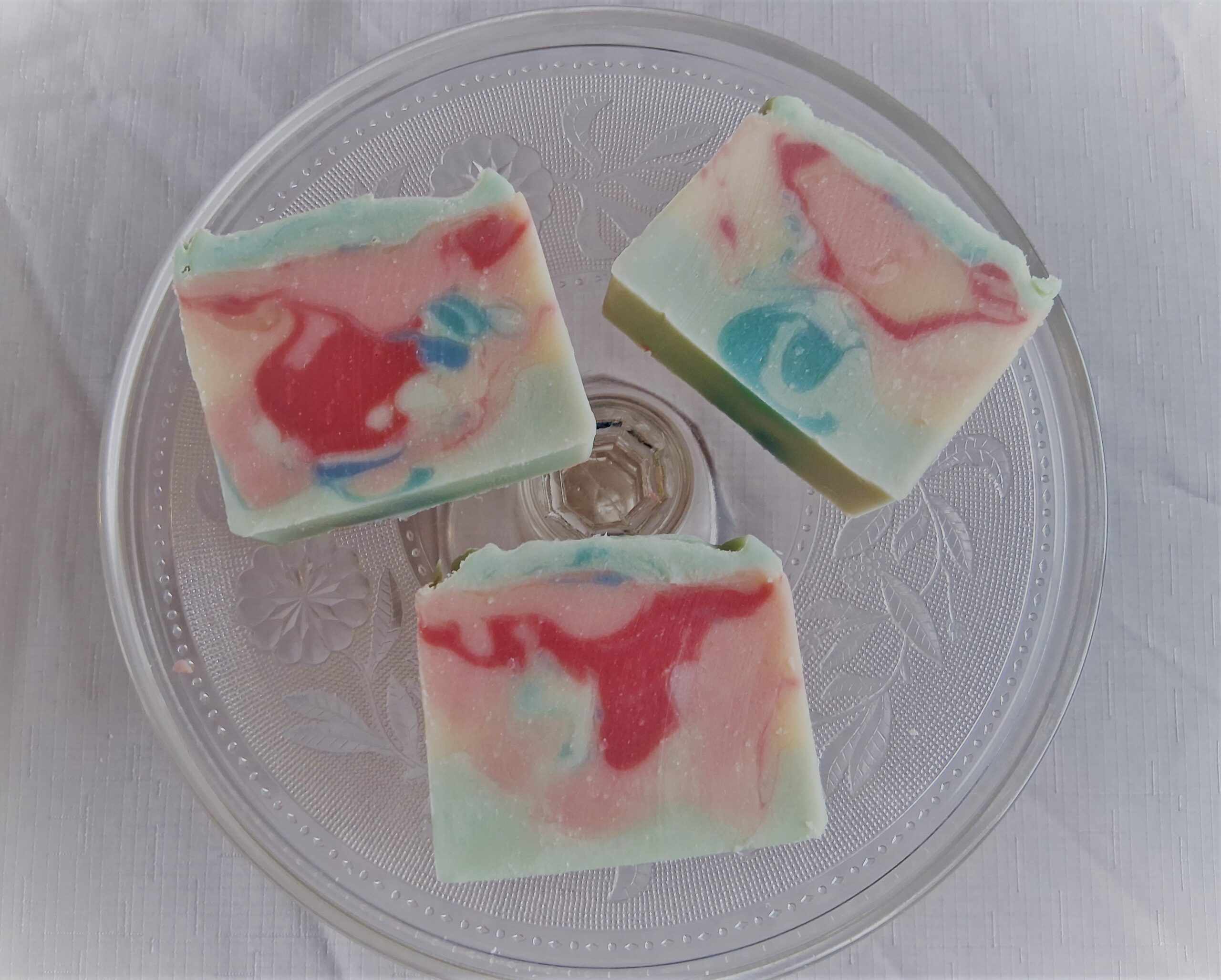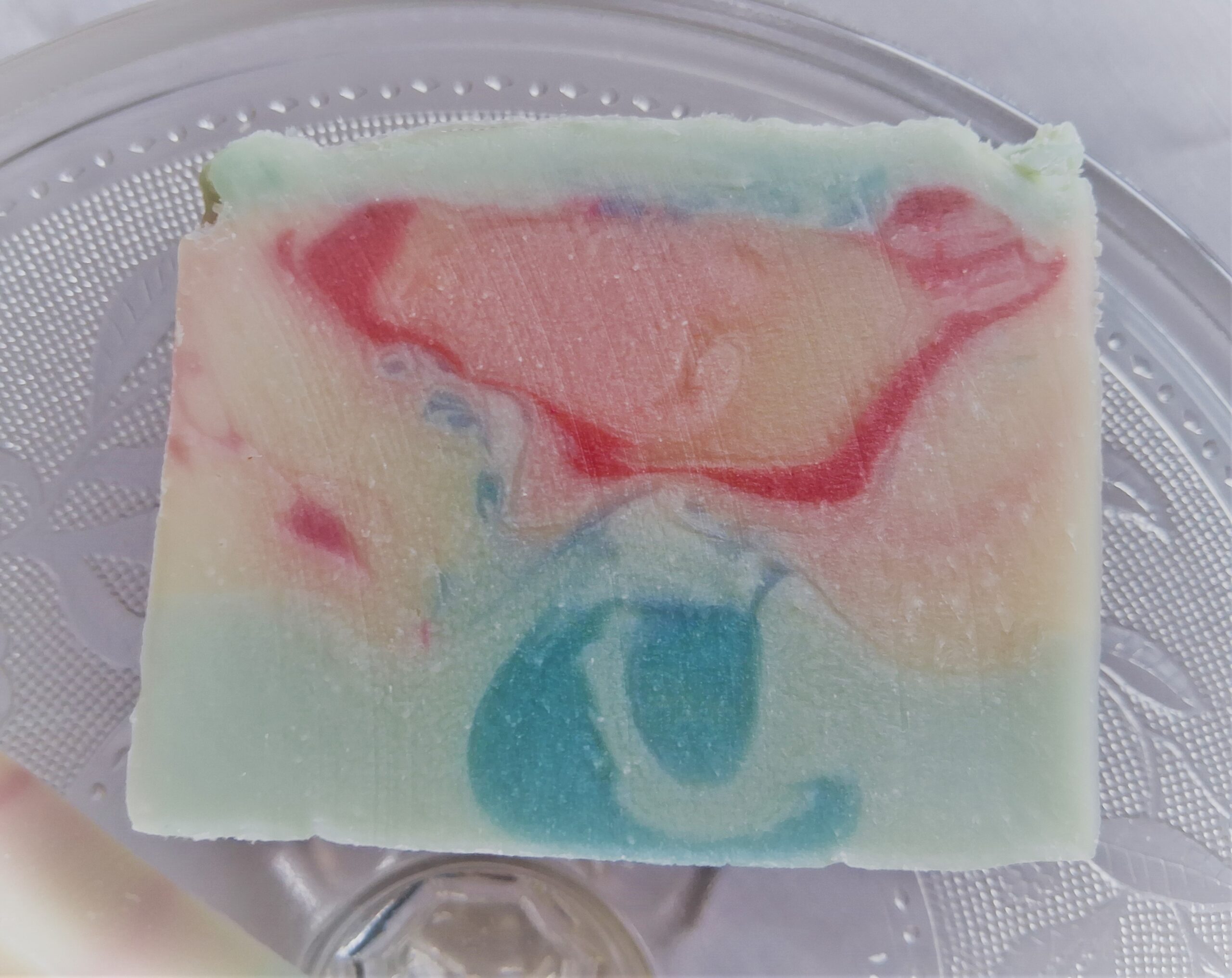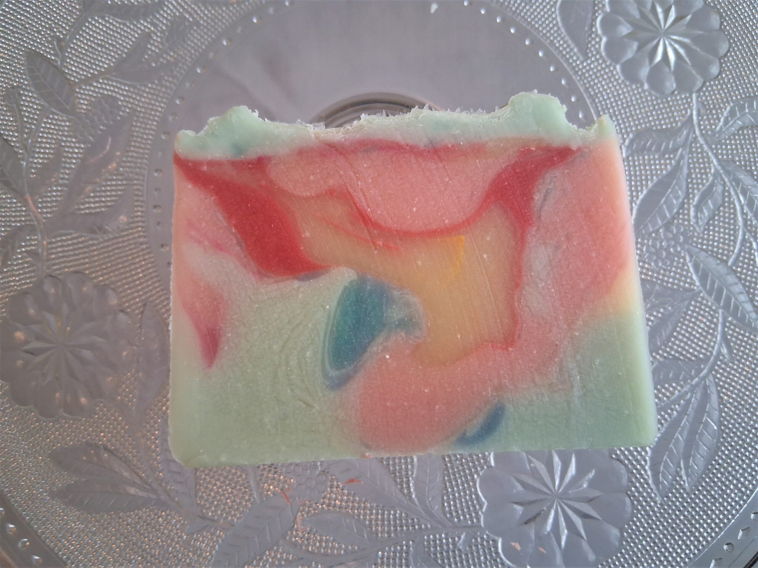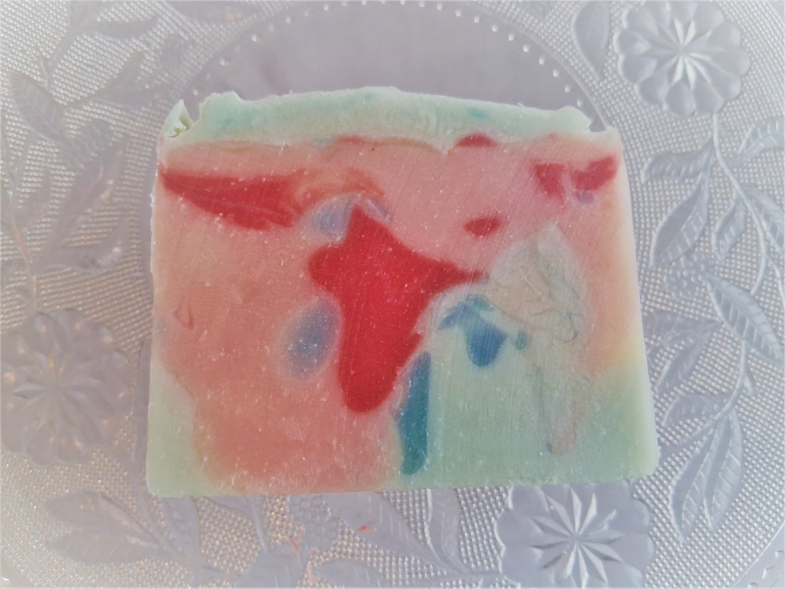 This pale blue soap has lovely swirls of light blue, dark and light pinks, and a touch of pale yellow. It’s very pretty and unique. It will look like useful art in your soap dish!